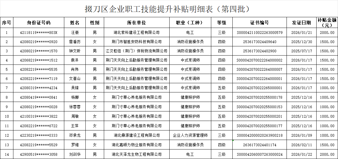 根据《省人社厅 省财政厅关于印发(湖北省失业保险支持企业参保职工技能提升补贴办法)的通知》(鄂人社发〔2017〕34号)文件精神、《湖北省人力资源和社会保障厅 湖北省财政厅关于实施失业保险技能提升差异化补贴政策的通知》(鄂人社发〔2025〕10号)文件精神,拟对汪豪等14名审核通过的企业职工发放技能提升补贴,现将拟发放名单及金额予以公示(名单附后),公示时间为2026年4月1日至2026年4月10日。公示期间,欢迎社会各界和广大市民对公示内容予以监督,发现问题可通过来访、来电、来信等方式向我中心反映。