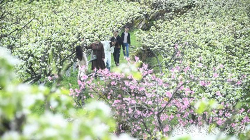 4月6日,走进椒园镇黄坪村,千亩梨园正值盛花期。一树树梨花白得纯粹,开得热烈,微风过处,花瓣如雪片般轻轻飘落。游客行走在梨园栈道上,不时走进林间拍照打卡,果农们穿梭其间,抢抓时节给梨花人工授粉。