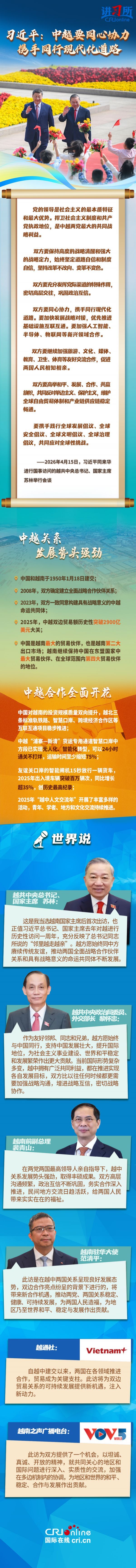 4月15日,中共中央总书记、国家主席习近平在人民大会堂同来华进行国事访问的越共中央总书记、国家主席苏林举行会谈。习近平指出,无论国际形势如何变化,中方始终将越南作为周边外交优先方向,愿同越方秉持初心、赓续友谊,团结协作、相互支持,继续按照“六个更”总体目标,高质量推进全面战略合作,加快构建更高水平具有战略意义的中越命运共同体,为推动构建人类命运共同体作出更大贡献。
