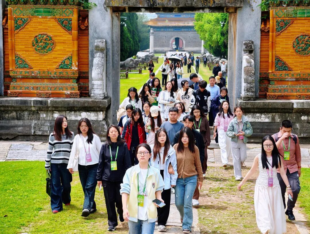世界文化遗产明显陵前,红墙黄瓦映着苍松翠柏,学子们驻足凝视斑驳的石刻,指尖抚过历经岁月沧桑的纹饰,聆听着明代嘉靖皇帝与这座城市的渊源,感受着古代建筑艺术的恢弘与精巧。