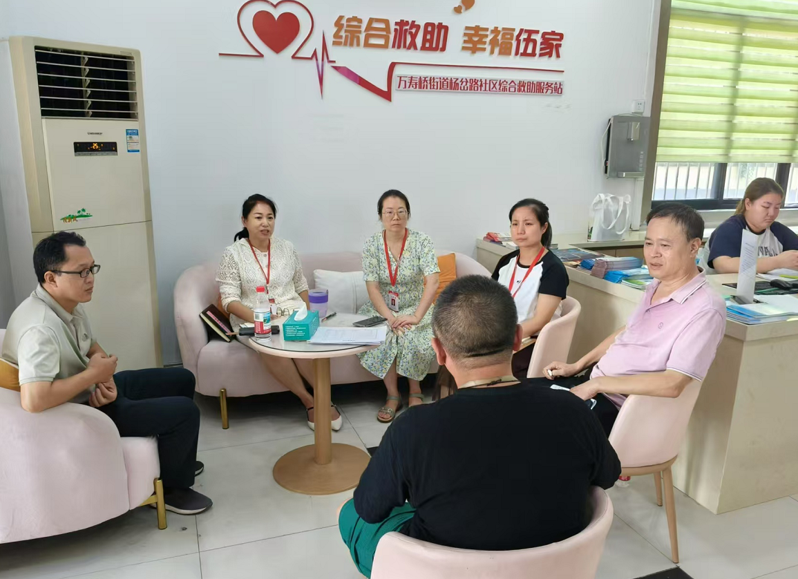 刘耀垒(左)在杨岔路社区和居民商议综合救助服务站试点建设。