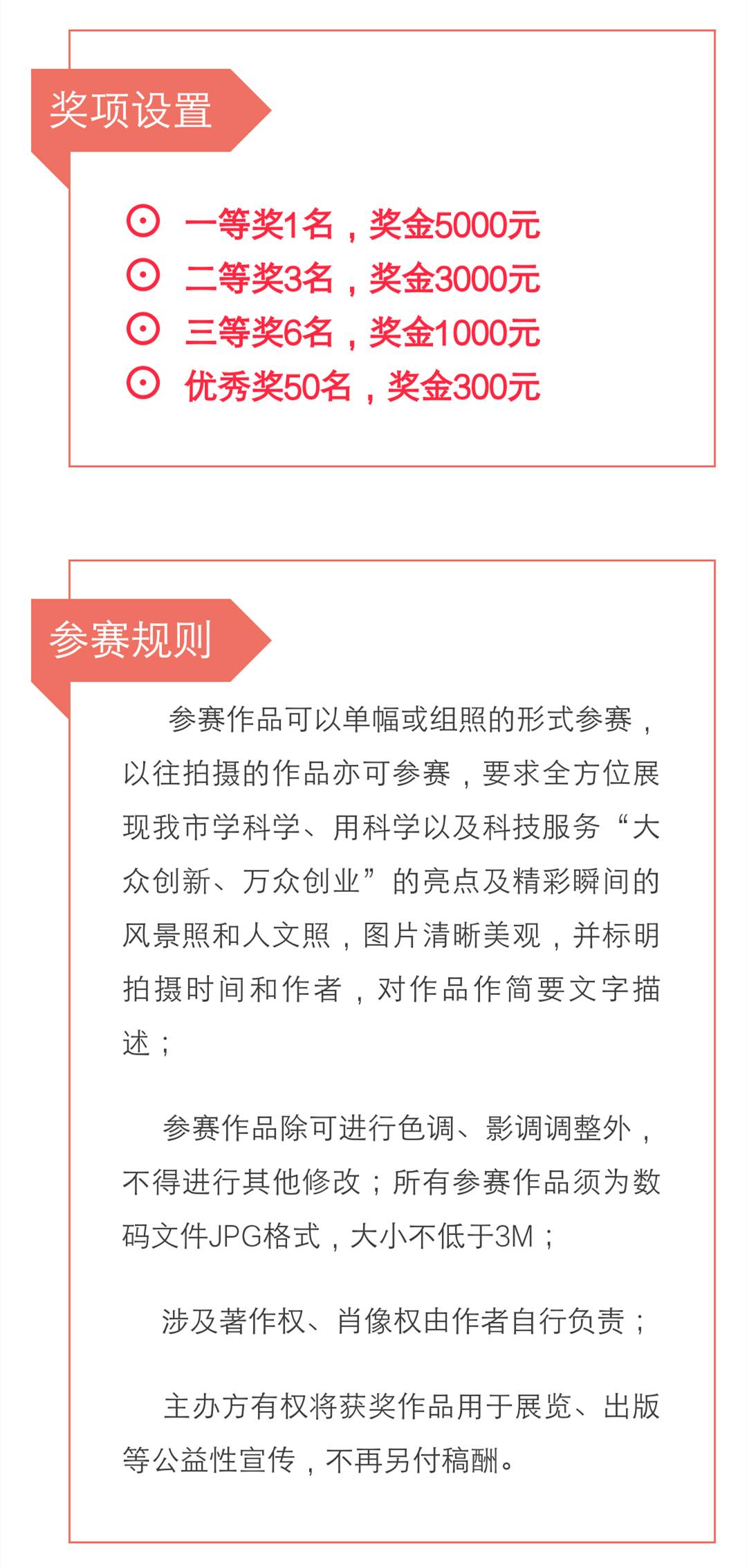 为保障整个活动有条不紊、有效有序开展,摄影大赛期间,主办方将邀请摄影人士前往各县市区及我市科普示范企业(社区)采风,全方位拍摄科普知识服务于民,助力地方经济发展的摄影作品。