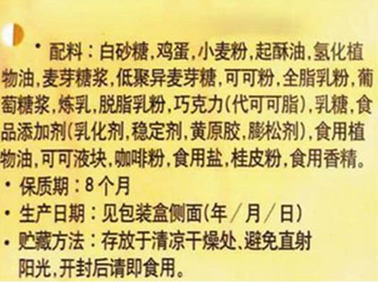 2、配料表:按照“食物用料量递减”的标示原则,食品配料表按序标示了食品的原料、辅料、食品添加剂等信息。所有使用的添加剂种类必须在配料表中标示出来,购买选择时应予关注。如“氢化植物油”、“植物奶油”、“植物黄油”、“人造黄油”、“蔗糖”、“果糖”、“盐”、“起酥油”等都可在其中看到。
